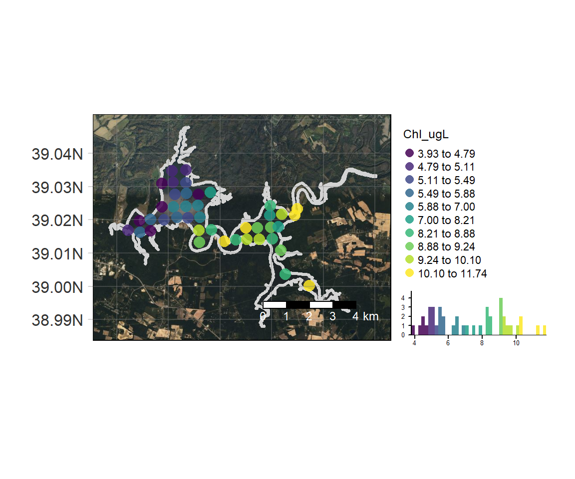 Map_WQ_basemap(WQ_extent = lake_extent, sample_points = samples, WQ_parameter = "Chl_ugL", map_title= "Water Quality Map", points_style = "quantile", histogram = TRUE)